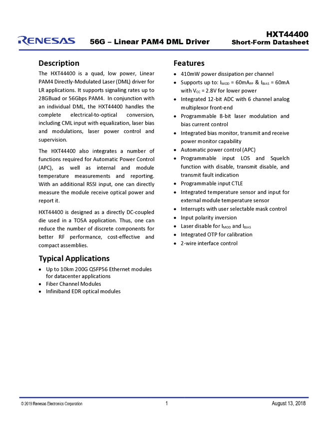 HXT44400 56Gb/s PAM4 DML Driver