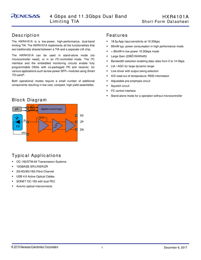 HXR4101A 4/11.3Gbps Dual Band Limiting TIA