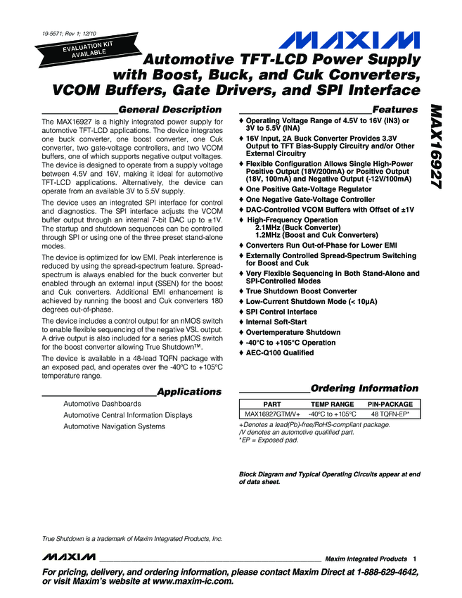 MAX16927 Automotive TFT-LCD Power Supply with Boost, Buck, and Cuk Converters, VCOM Buffers, Gate Drivers, and SPI Interface