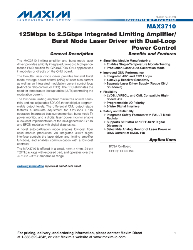 MAX3710 125Mbps to 2.5Gbps Integrated Limiting Amplifier/Burst-Mode Laser Driver wi...