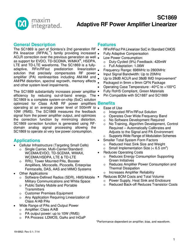 SC1869 Adaptive RF Power Amplifier Linearizer