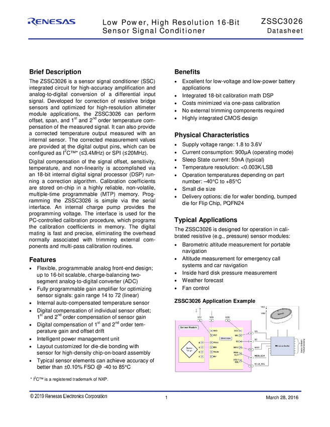 ZSSC3026 Low Power, High Resolution 16-Bit Sensor Signal Conditioner