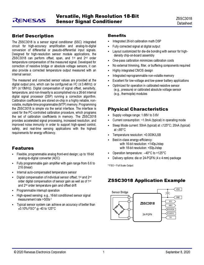 ZSSC3018 Versatile, High Resolution 18-Bit Sensor Signal Conditioner