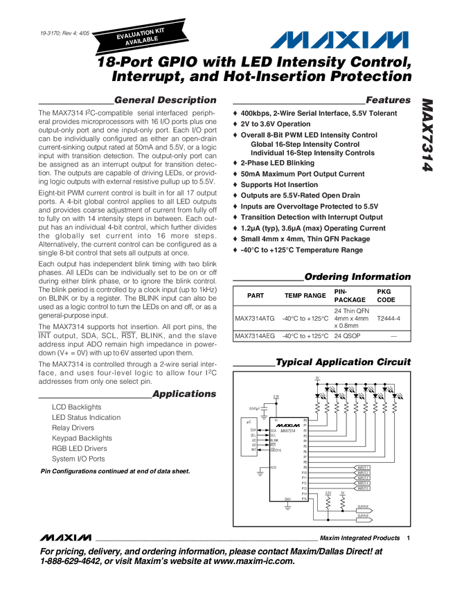 MAX7314 18-Port GPIO with LED Intensity Control, Interrupt, and Hot-Insertion Prote...