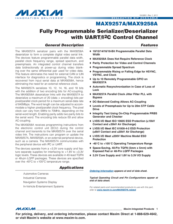 MAX9257A Programmable Serializer/Deserializer with UART/I²C Control Channel
