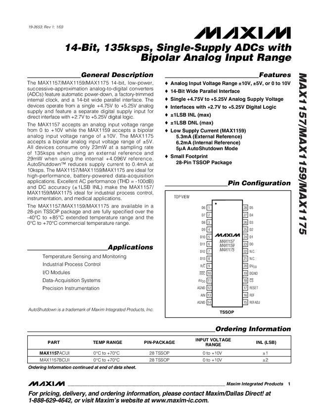 MAX1157 14-Bit, 135ksps, Single-Supply ADCs with Bipolar Analog Input Range