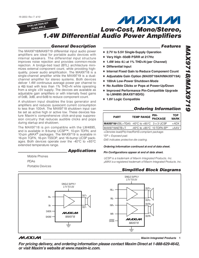 MAX9718 Low-Cost, Mono/Stereo, 1.4W Differential Audio Power Amplifiers