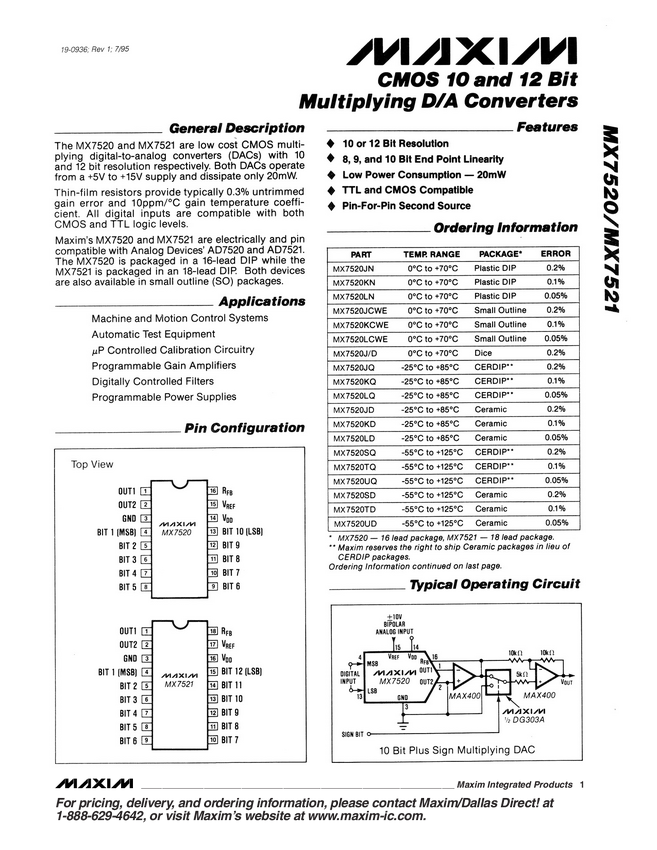 MX7520 CMOS, 14- and 12-Bit Multiplying DACs