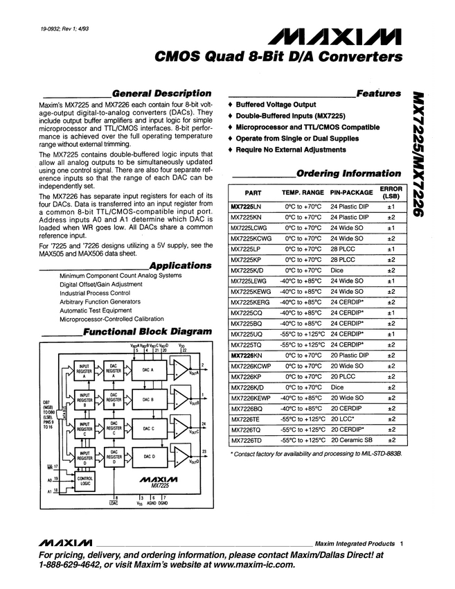 MX7225 CMOS, Quad, 8-Bit DAC with Voltage-Output Amplifier Latches