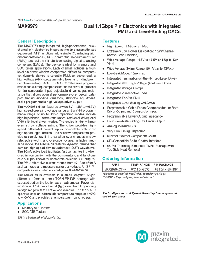 MAX9979 Dual 1.1Gbps Pin Electronics with Integrated PMU and Level-Setting DACs