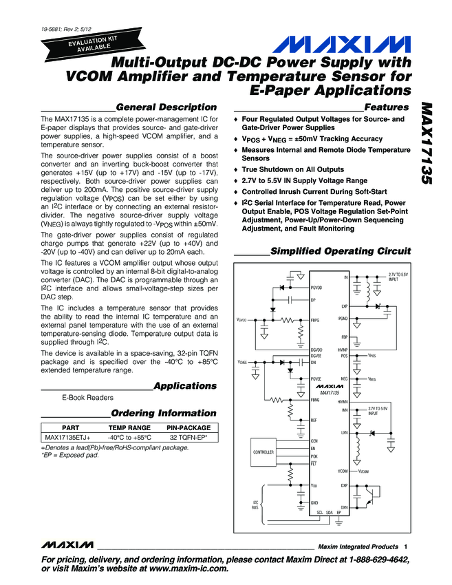 MAX17135 Multi-Output DC-DC Power Supply with VCOM Amplifier and Temperature Sensor for E-Paper Applications