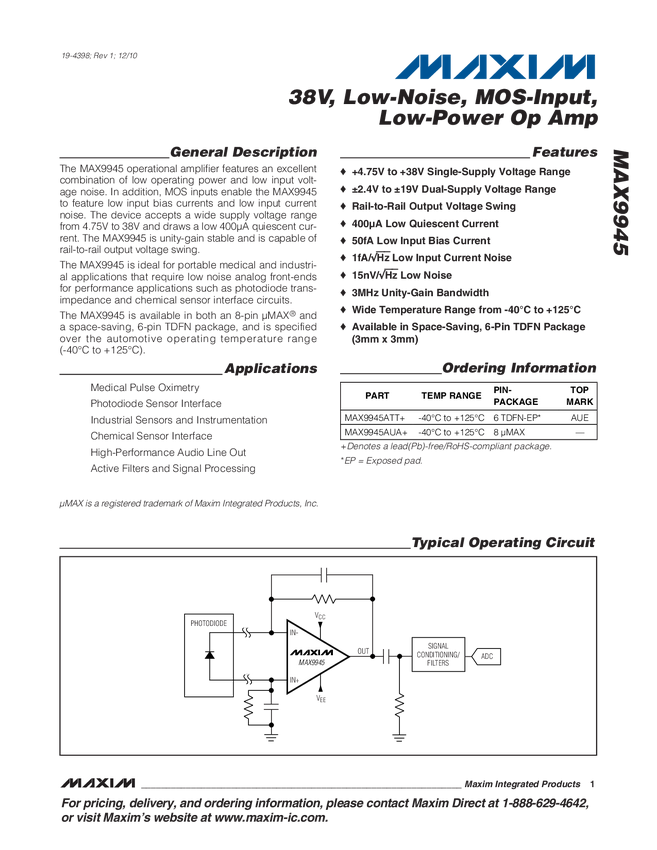 MAX9945 38V, Low-Noise, MOS-Input, Low-Power Op Amp