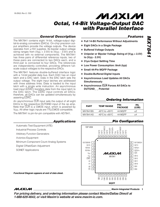 MX7841 Octal, 14-Bit Voltage-Output DAC with Parallel Interface