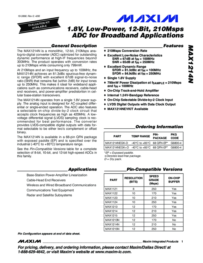 MAX1214N 1.8V, Low-Power, 12-Bit, 210Msps ADC for Broadband Applications