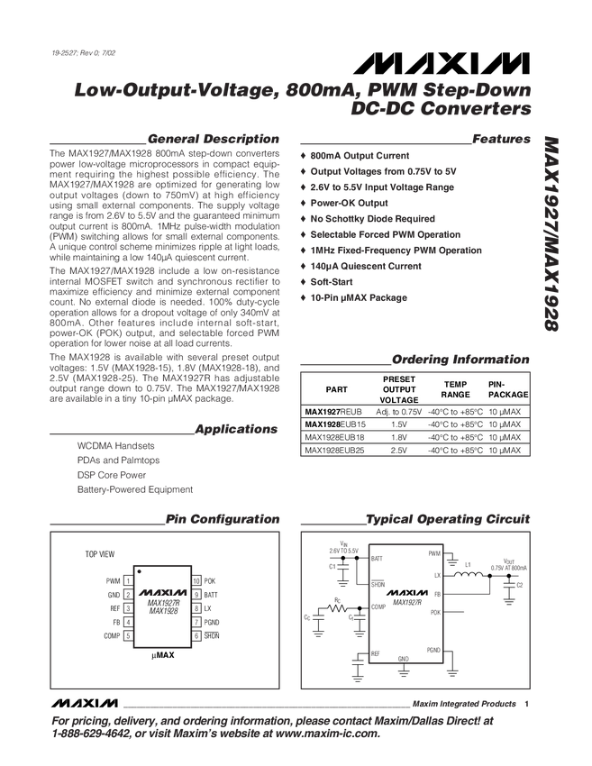 MAX1928 Low-Output-Voltage, 800mA, PWM Step-Down DC-DC Converters