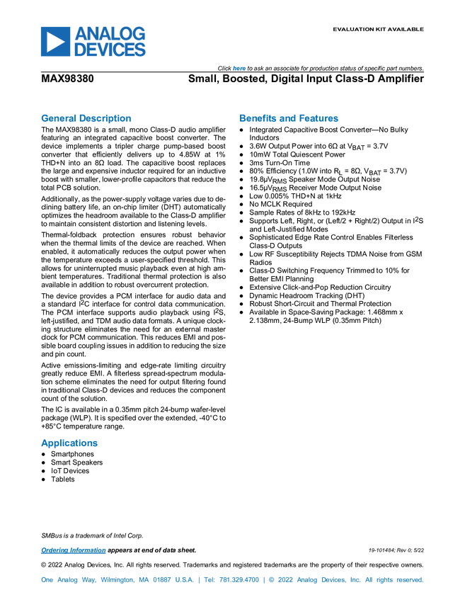 MAX98380 Small, Boosted, Digital Input Class-D Amplifier