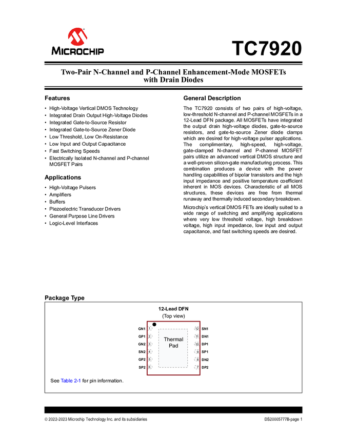 TC7920 Two-Pair N-Channel and P-Channel Enhancement-Mode MOSFETs with Drain Diodes Data Sheet
