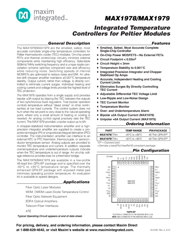 MAX1978 MAX1978, MAX1979 Integrated Temperature Controllers for Peltier Modules