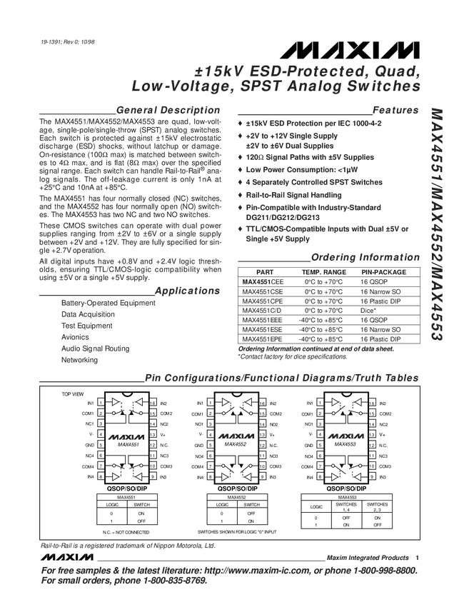 MAX4553 ±15kV ESD-Protected, Quad, Low-Voltage, SPST Analog Switches