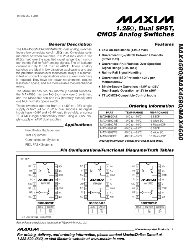 MAX4600 1.25Ω, Dual SPST, CMOS Analog Switches