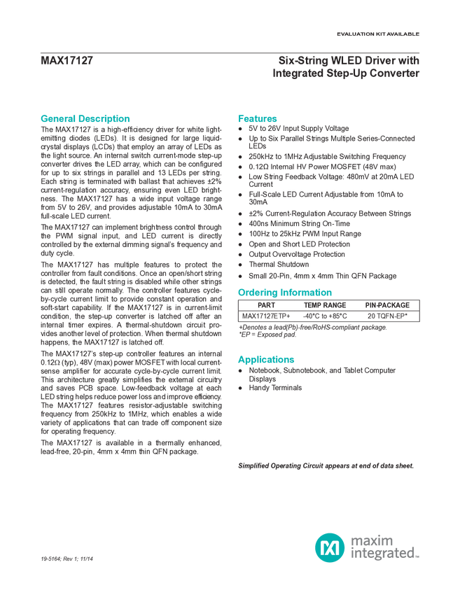 MAX17127 Six-String WLED Driver with Integrated Step-Up Converter