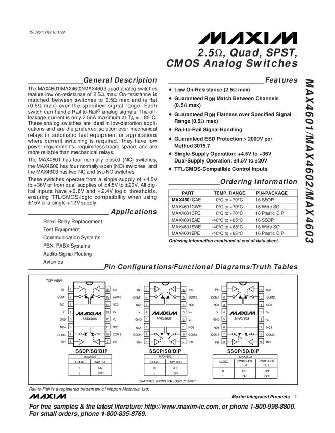 MAX4601 2.5Ω, Quad, SPST, CMOS Analog Switches