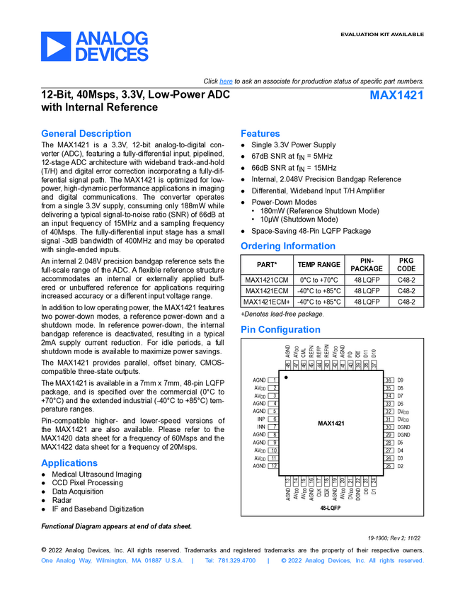 MAX1421 12-Bit, 40Msps, 3.3V, Low-Power ADC with Internal Reference