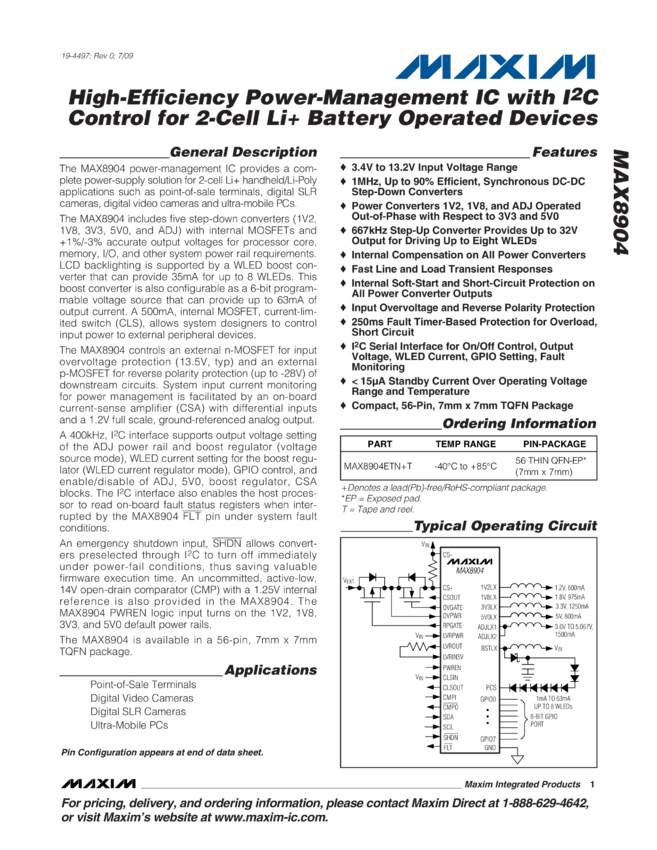 MAX8904 High-Efficiency Power-Management IC with I²C Control for 2-Cell Li+ Battery Operated Devices