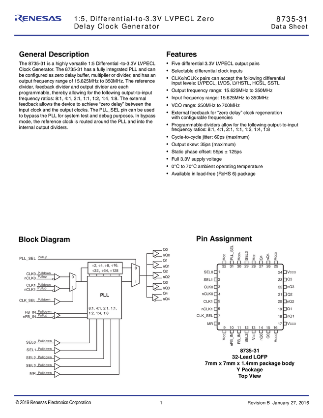 8735-31 1:5, Differential-to-3.3V LVPECL Zero Delay Clock Generator