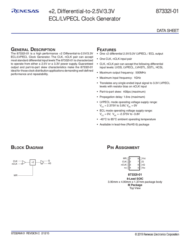 87332I-01 ÷2,Differential-to-2.5V/3.3V ECL/LVPECL Clock Generator