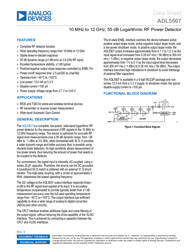 ADL5507 10 MHz to 12 GHz, 55 dB Logarithmic RF Power Detector
