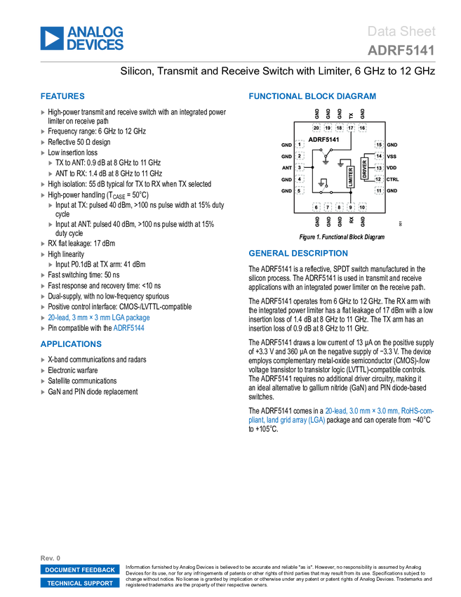 ADRF5141 Silicon, Transmit and Receive Switch with Limiter, 6 GHz to 12 GHz