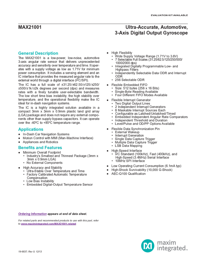 MAX21001 Ultra-Accurate, Automotive, 3-Axis Digital Output Gyroscope