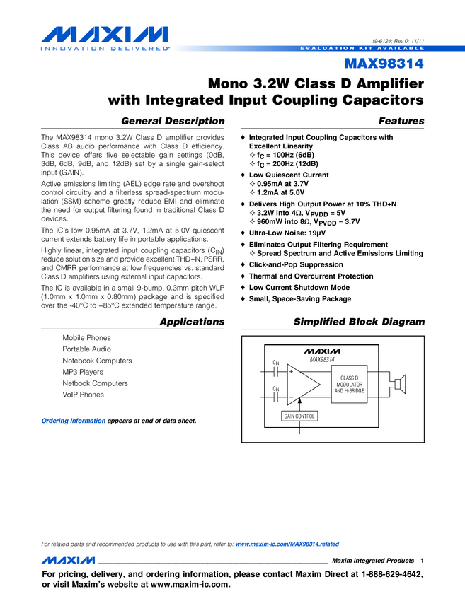 MAX98314 Mono 3.2W Class D Amplifier with Integrated Input Coupling Capacitors