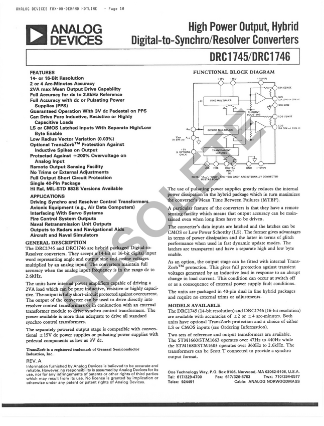 DRC1745 High Power Output Hybrid Digital-to-Synchro/Resolver Converter