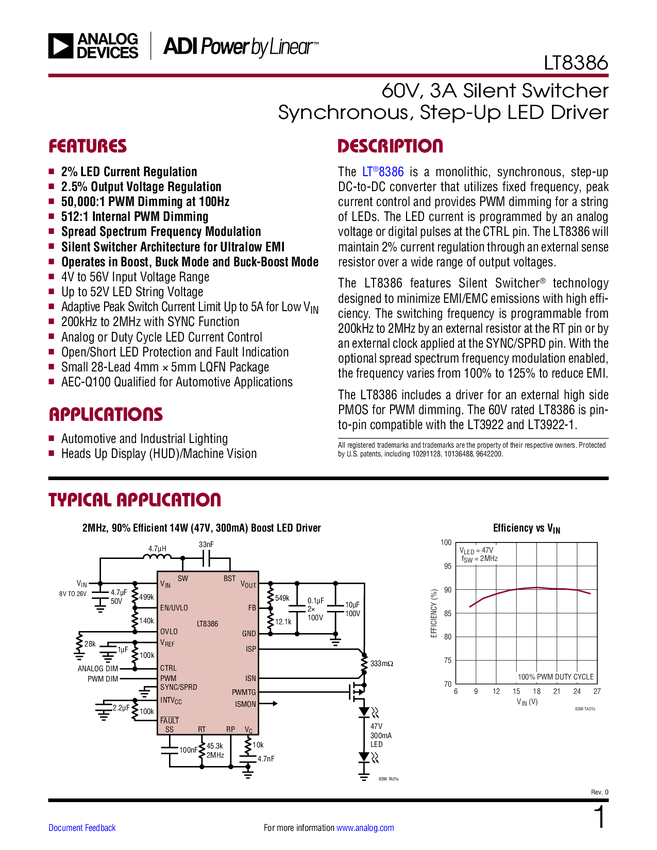 LT8386 60V, 3A Silent Switcher Synchronous, Step-Up LED Driver