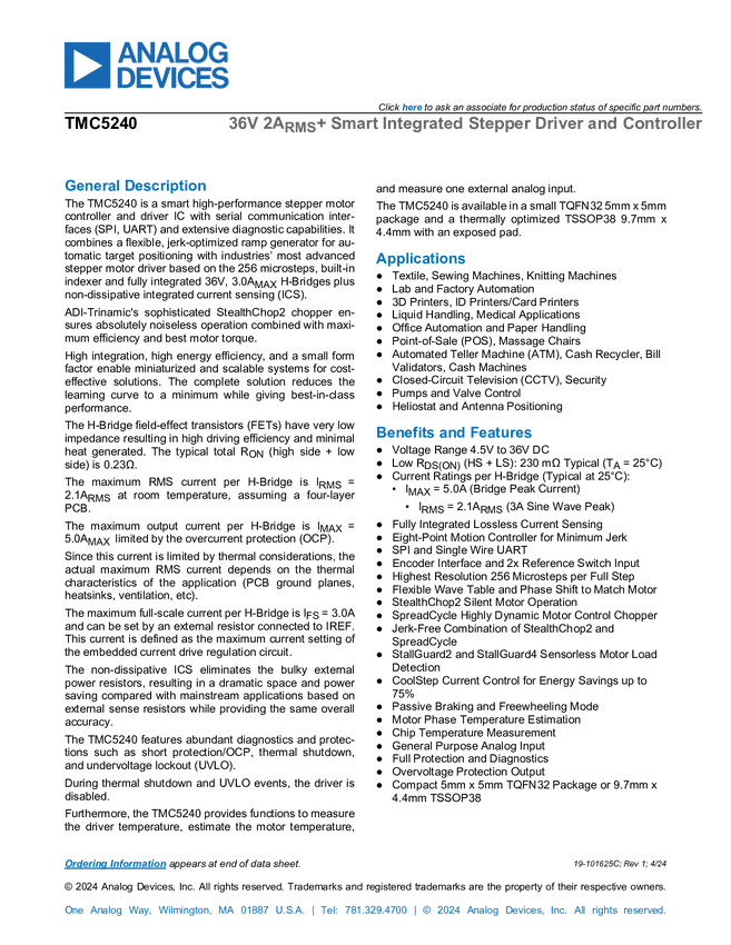 TMC5240 36V 2A+ Smart Integrated Stepper Driver and Controller