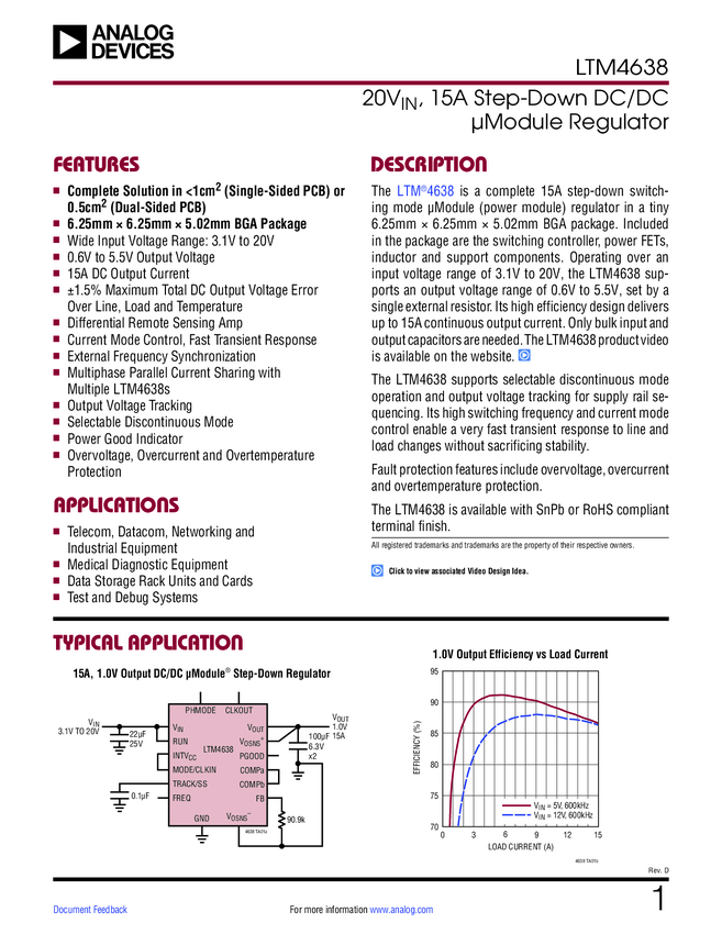 LTM4638 20V, 15A Step-Down DC/DC µModule Regulator