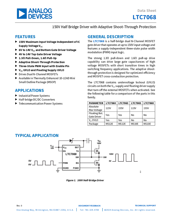 LTC7068 150V Half Bridge Driver with Adaptive Shoot-Through Protection