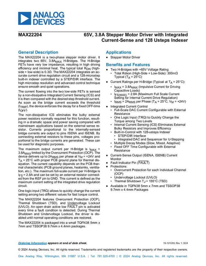 MAX22204 65V, 3.8A Stepper Motor Driver with Integrated Current-Sense and 128 Usteps...