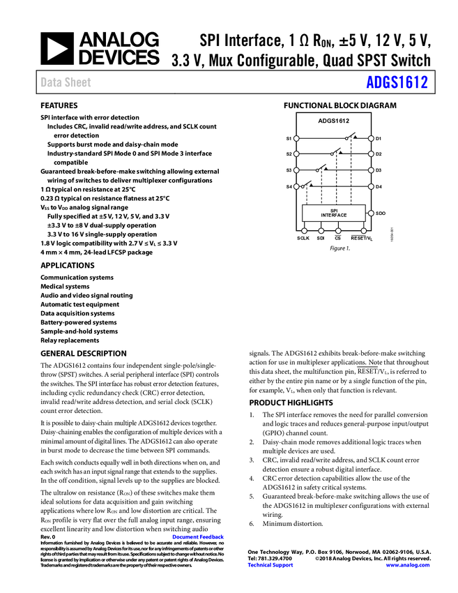 ADGS1612 SPI Interface, 1 Ω R, ±5 V, 12 V, 5 V, 3.3 V, Mux Configurable, Quad SPST S...