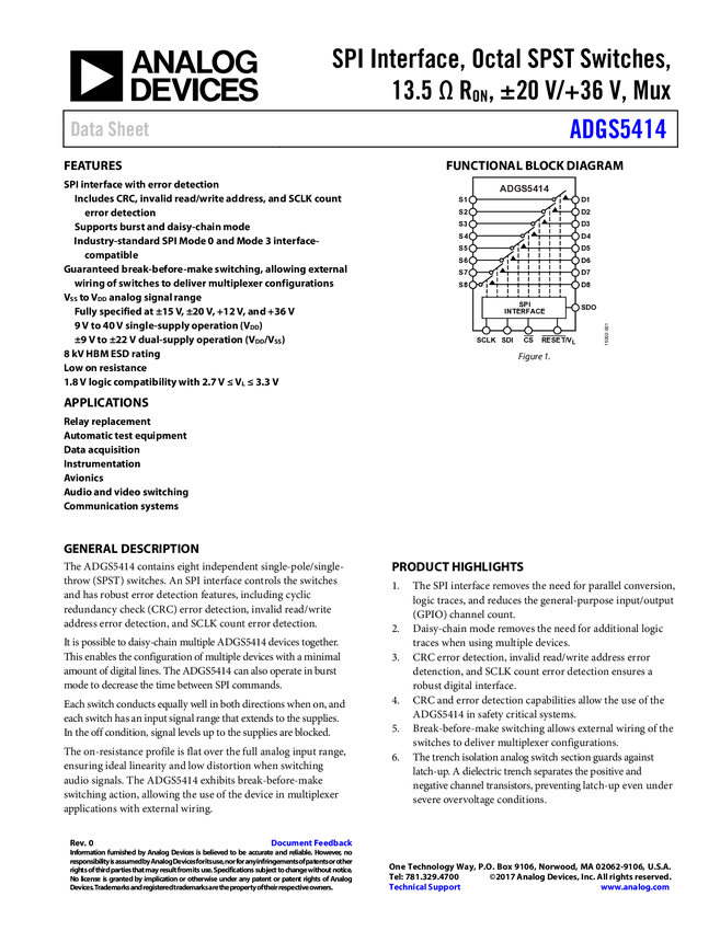ADGS5414 SPI Interface, Octal SPST Switches, 13.5 Ω R, ±20 V/+36 V, Mux