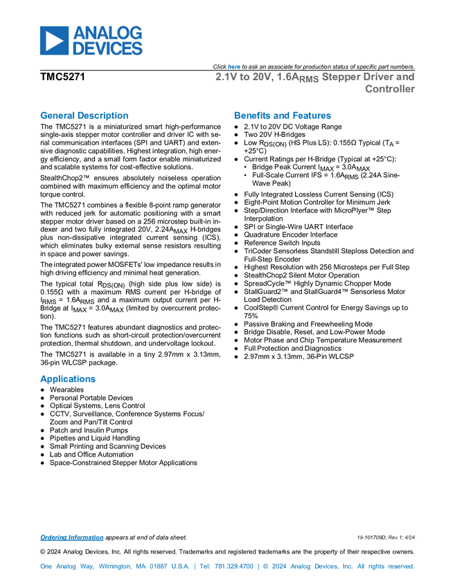 TMC5271 2.1V to 20V, 1.6A Stepper Driver and Controller
