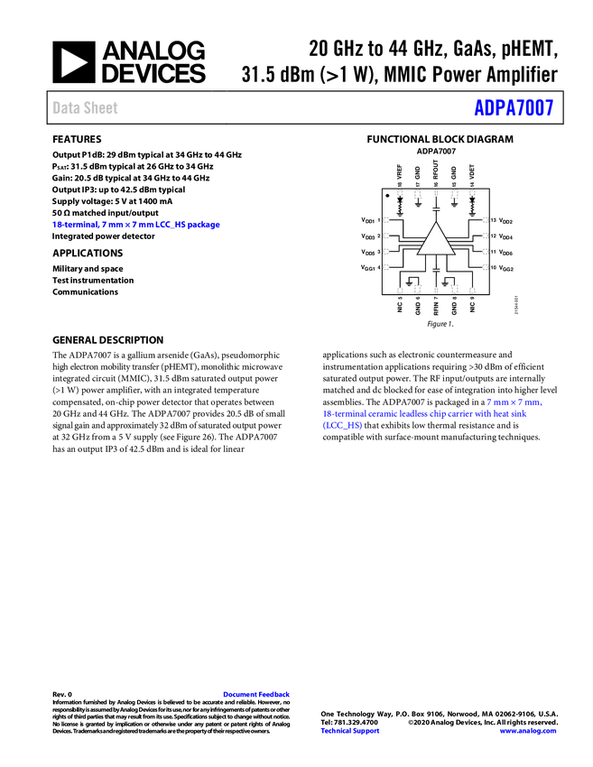 ADPA7007 GaAs, pHEMT, MMIC,1 W Power Amplifier, 18 GHz to 44 GHz