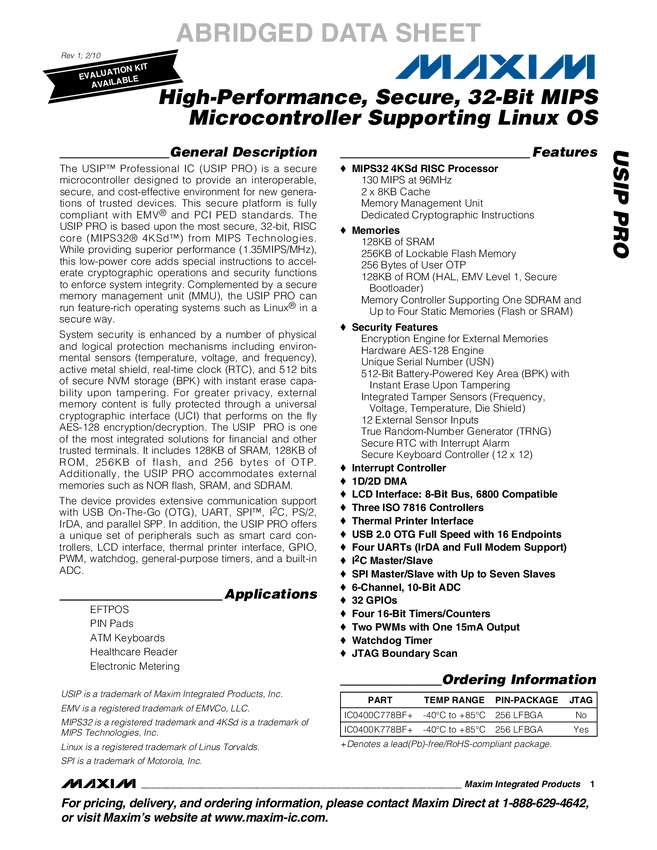 IC0400C778BF DeepCover Secure Microcontroller with MIPS 4KSd Processor Core