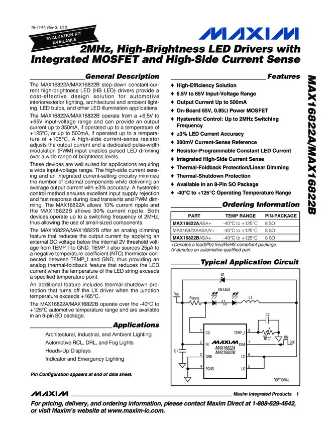 MAX16822 A, MAX16822B 2MHz, High-Brightness LED Drivers with Integrated MOSFET and H...