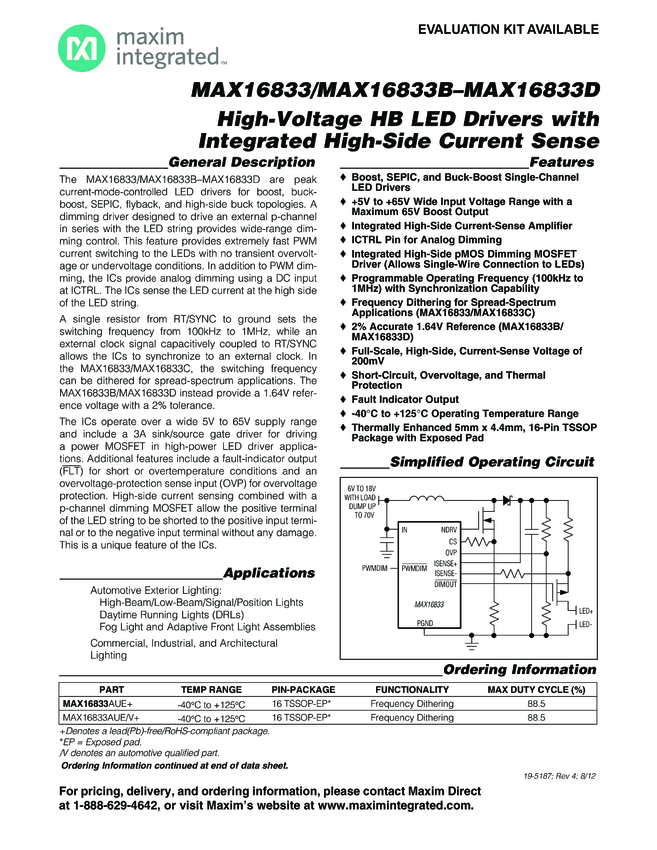 MAX16833, MAX16833B, MAX16833C, MAX16833D High-Voltage HB LED Drivers with Integrated High-Side Current Sense