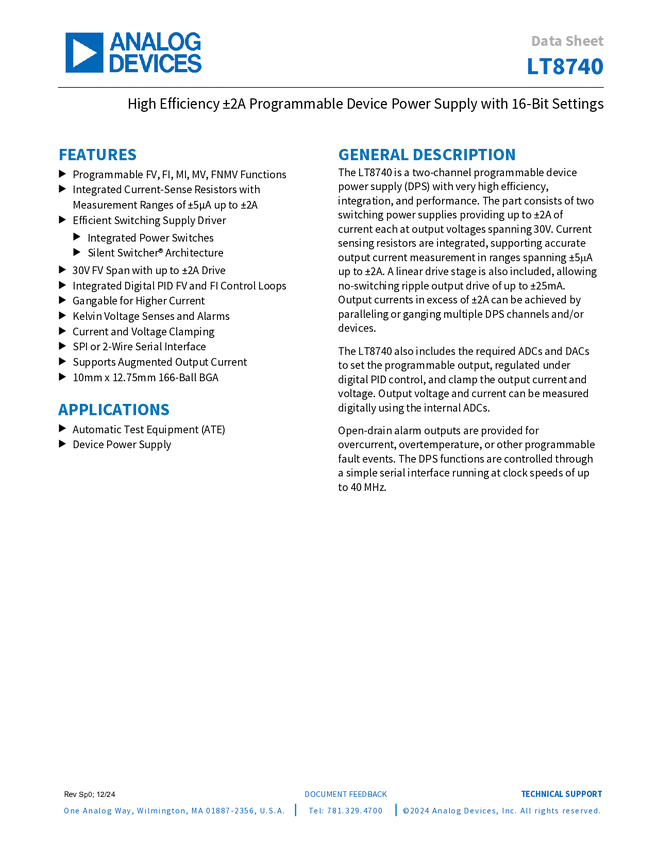 LT8740 High Efficiency ±2A Programmable Device Power Supply with 16-Bit Settings