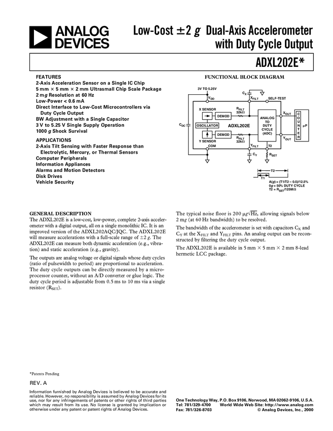 ADXL202 Low-Cost, Low-Power, Complete Dual-Axis MEMS® accelerometer