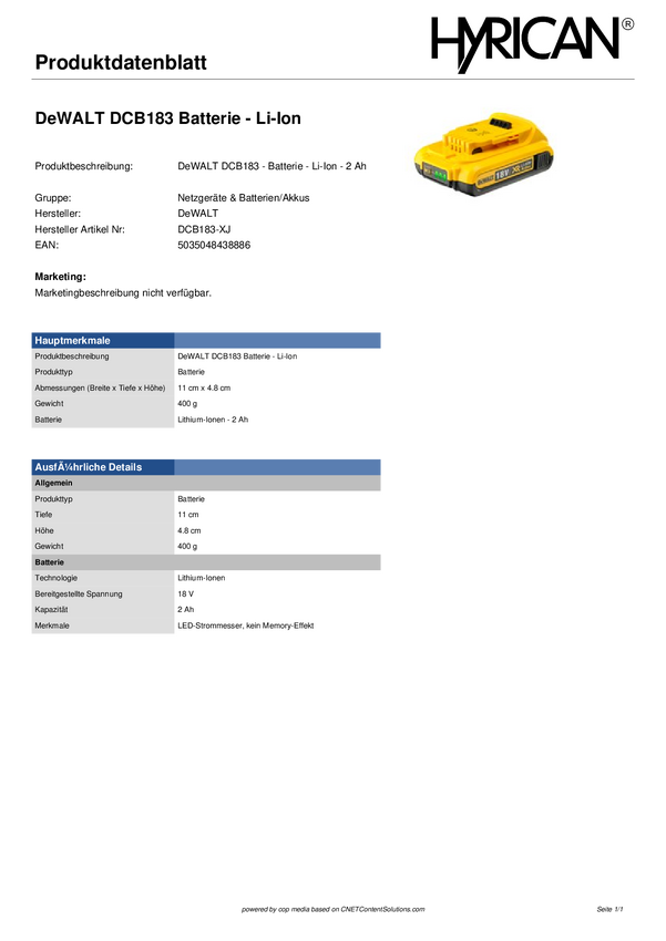 DCB183-XJ Akumulator do elektronarzędzi DEWALT DCB183 DCB183-XJ, 2 Ah, 18 V